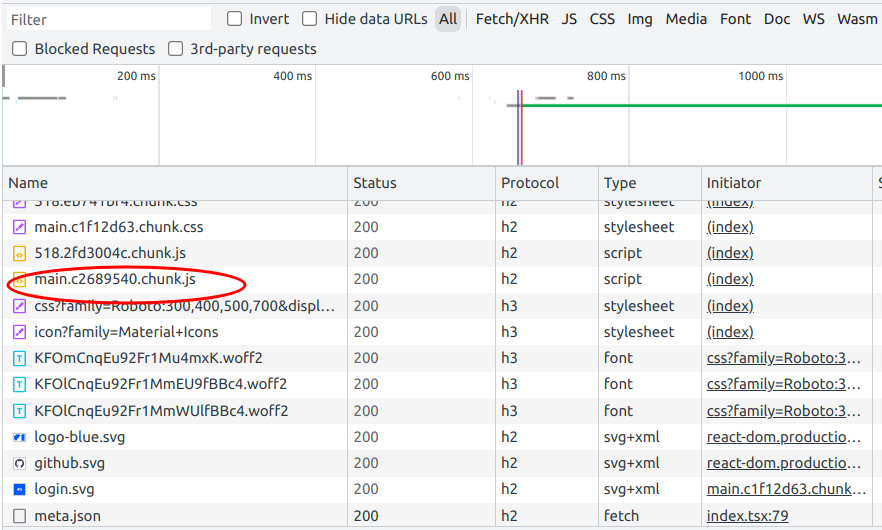 In the image below we can see a screen snip of developer tools that show a list of different contents that is downloaded while loading the page which also includes a single main chunk of javascript named main.c2689540.chunk.js.